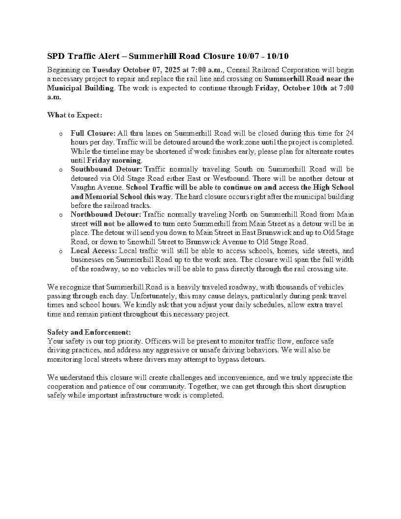 Traffic Advisory Summerhill Road 10-7-25 to 10-10-25